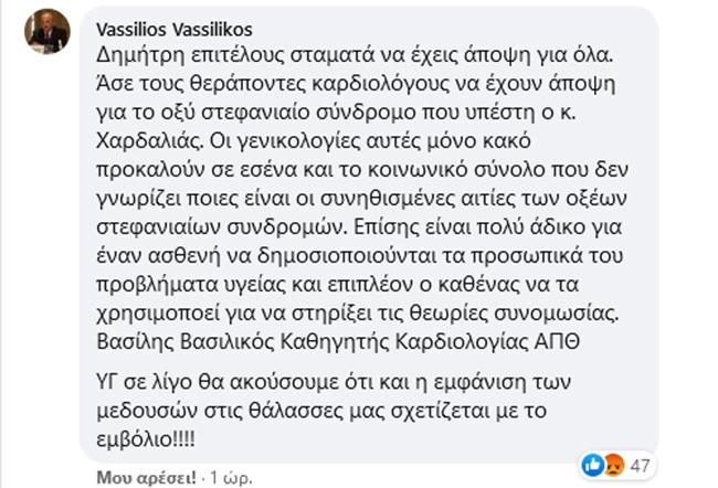 Σε σχόλιό του κάτω από την ανάρτηση, ο κ. Βασιλικός, ο οποίος μάλιστα νοσηλεύτηκε με κορονοϊό τον περασμένο χειμώνα στο Ιπποκράτειο νοσοκομείο, αντιδρά γράφοντας: "Δημήτρη επιτέλους σταματά να έχεις άποψη για όλα. Άσε τους θεράποντες καρδιολόγους να έχουν άποψη για το οξύ στεφανιαίο σύνδρομο που υπέστη ο κ. Χαρδαλιάς. Οι γενικολογίες αυτές μόνο κακό προκαλούν σε εσένα και το κοινωνικό σύνολο που δεν γνωρίζει ποιες είναι οι συνηθισμένες αιτίες των οξέων στεφανιαίων συνδρομών. Επίσης είναι πολύ άδικο για έναν ασθενή να δημοσιοποιούνται τα προσωπικά του προβλήματα υγείας και επιπλέον ο καθένας να τα χρησιμοποεί για να στηρίξει τις θεωρίες συνομωσίας. Βασίλης Βασιλικός Καθηγητής Καρδιολογίας ΑΠΘ ΥΓ σε λίγο θα ακούσουμε ότι και η εμφάνιση των μεδουσών στις θάλασσες μας σχετίζεται με το εμβόλιο!!!!".