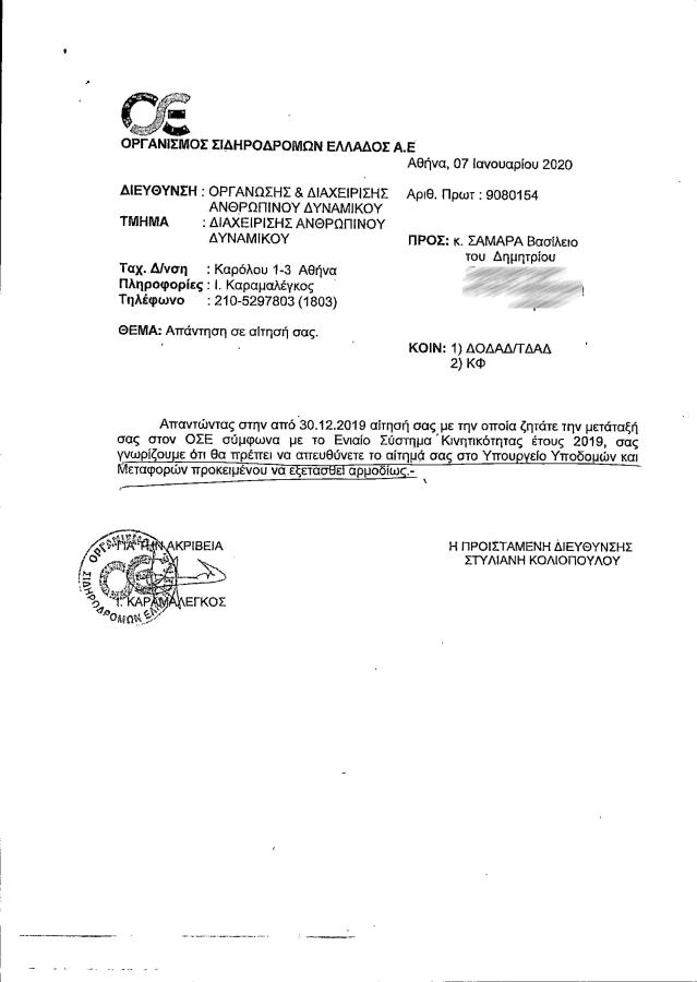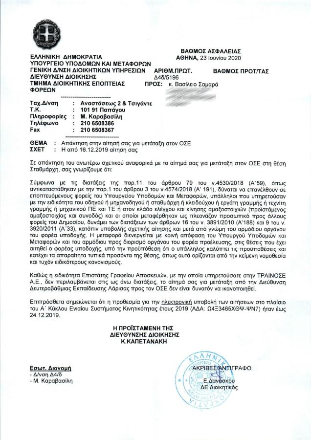 «Καθώς η ειδικότητα επιστάτης γραφείου αποσκευών, με την οποία υπηρεστούσατε στην ΤΡΑΙΝΟΣΕ ΑΕ, δεν περιλαμβάνεται στις ως άνω διατάξεις, το αίτημά σας για μετάταξη από την Διεύθυνση Δευτεροβάθμιας Εκπαίδευσης Λάρισας προς τον ΟΣΕ δεν είναι δυνατόν να ικανοποιηθεί».